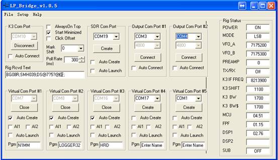 事实上,我们还可以建立更多的远程实际串口和本地虚拟串口的对应,用以操作旋转器、天线切换、滤波器切换等功能,这里就不用一一例举了。上面的软件中的LP-BRIDGE是另一个虚拟串口软件,K3的用户可能比较熟悉,他可以使多个软件同时对K3进行控制,也有专门的版本支持其他牌号的电台。其界面如下图所示: