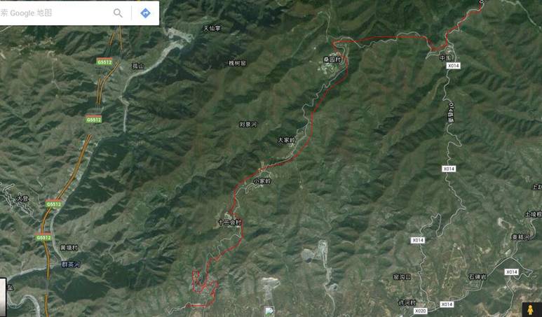 Unnamed RD是恶峪村,离群英胡的直线距离应该不到10KM.蓝色的曲线是谷歌地图推荐的驾车线路。今天我们行走的路线就是把这个蓝圈走了个闭环。