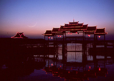 夜晚水乡的灯火给人以节日的气氛
