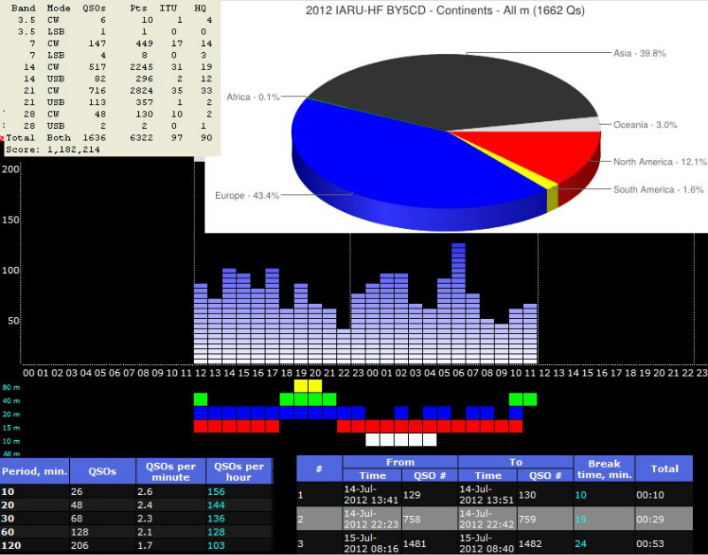 今年回归参加个人比赛后,感觉像个新手,对这种24小时的全波段混合模式的比赛很不适应,主要是波段分配和传播计划上比较失败。说实话我比赛前也没有好好准备,也就做了个N1MM用的HQ历史查询表,另外用去年BXHQ的log做了一个波段分布对比,借此找出每个时段最佳的工作波段,另外用HAMCAP看了一遍预测,感觉主力波段应该是晚上20米和白天15米,这个跟去年的log统计也是吻合的,于是就用这个指导思想参加比赛了,因为是做SO2R,所以当时就没有考虑系数问题,我觉得这些系数可以用第二个电台去一个个找过来。