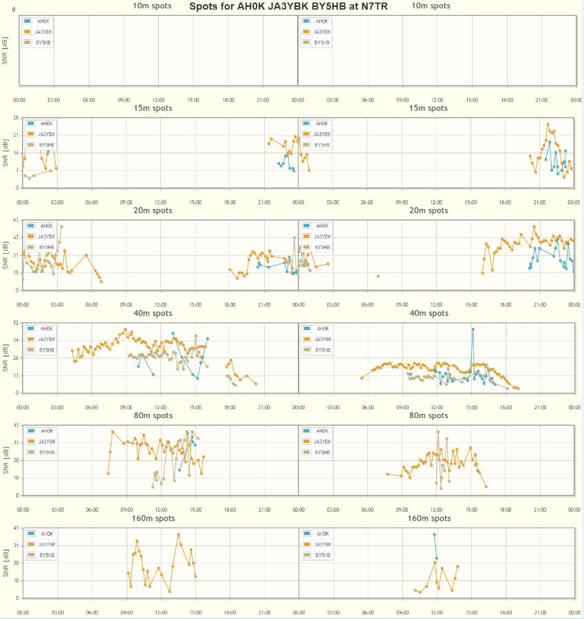 从成绩上来看,大家很容易感觉AH0K是个很强的大台,但是我在实际操作中有了自己的粗略认识:AH0K有先天优势,作为大洋洲台,做的台大部分是3分,同样的Qso数量,分数高很多,设台地点的电磁环境比较好,抄收弱信号的能力强,纬度比较低,这在太阳活动的低谷时期相对其他台的优势会更明显,但是它的地理位置并不是像大多人认为的那样离开北美近,离开欧洲远,它的实际经度和韩国差不多,传播更像是日韩,通欧洲台没有任何困难,离开美国本土却还有上万公里,当传播不好的时候,北美照样难通,和中国相比,AH0K的优势在于需要越过北极通联很少,通联美东和加勒比海的系数相对容易很多,和日本对北美的情况类似,优势不是近了,而是因为不需要越过北极。传播的方向和时段和中国很类似,中午前后和后半夜都存在垃圾时段,之所以能通很多台,其主要原因就是KH0这个字头往往只有一个台,最多不超过两个台在参赛,大家为了系数,都会主动去通它。从实际操作的体验来讲,他们的发射不强,尤其是低波段,经常叫不过国内或者日本条件好一些的台,摆摊的时候也容易受到欺负,我操作时曾经被JA3YBK轻松盖台并抢走频率,也被国内的BY5HB盖过台,还好BY5HB收听没有我这里好,我守住了频率,至于被远地的主叫台影响的事情就更多了,这种情况在BY5CD的时候很少发生,从这个角度来说,他们的天线还是不够强大,主要传播方向的地形也不是最优的,今后要做好INBAND也是有点难度的,通过上图的RBN信号对比,AH0K到欧美的信号远比不过JA3YBK,也不如BY5HB和B4T。总体感觉上如果BY5CD的噪声能更小一些的话,在QSO数量上打败AH0K是有可能的,可是没有如果,任何一个台都需要扬长避短,才能更好的发挥。