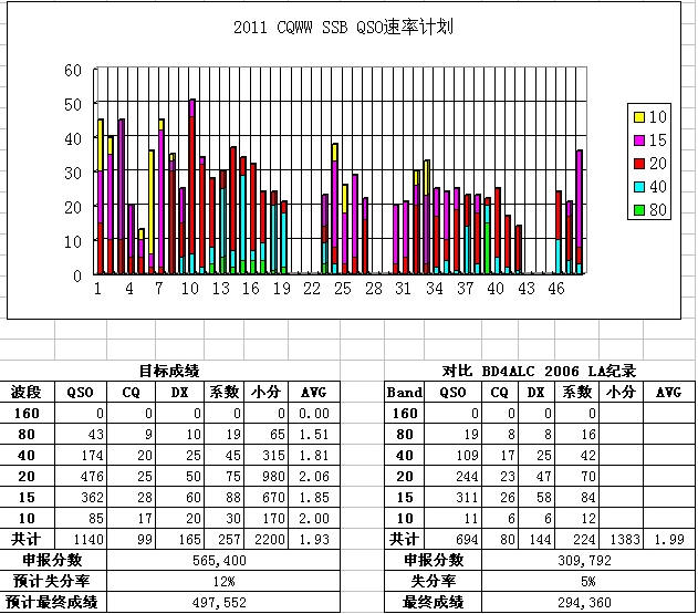 在上面的分析、学习过程中你基本上可以得到一个可以实现的大致轮廓了,原来的记录实际上是一个很普通的LA成绩,当时参数者对比赛的理解以及比赛经验也不会比你现在多,而且那个成绩少了一个晚上的低波段,所以80m,40m还可以改善余地,根据今年前些时候AA SSB的情况分析,好几个LA组的只用里20多小时的时间就超过1000qso,通常10月底的传播要明显优于9月初,另外今年的传播也比06年的时候要好,所以可以订出1200左右的qso的计划。