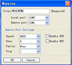 设置好本地串口号,和远程的串口号,比如远地电台连接到远地计算机的串口是COM1,那么你这里就选com1,本地串口号填的是你前面在com2com软件里设置的一对串口号之一,本例中 我们选com7,这样你就通过本地安装的log软件,比如logger32、N1MM、HRD...,里把控制电台的串口设为com8,就可以通过本地log软件去控制远程电台了。