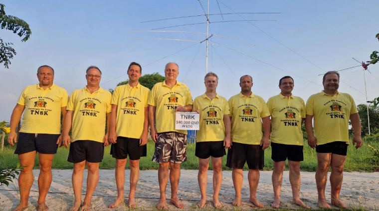 TN8K 2023远征队由CDXP俱乐部成员OK1BOA,OK1FCJ,OK1CRM,OK1GK,OK2ZA,OK2ZC,OK2ZI,OK6DJ 组成,2023年1月6日到达,1月21日离开,得益于年初太阳黑子暴增,在两周的操作中完成了16万五千个QSO,他们比较注重QSO数量,因此尽可能在各种模式上都做QSO,甚至出现在了10mFM模式上。 CDXP是捷克远征俱乐部的简称https://www.cdxp.cz,他们曾经组织过10多个远征,目的地主要是非洲。这次的刚果(布)远征使用的设备是:1台Elecraft K3,3台Kenwood TS480HX ,1台SunSDR2DX,1台SunSDR PRO,3台Icom 705。功放:五台JUMA PA1000。 天线配置为:6m 4单元八木,10-15-20包括WARC 3副Spiderbeam,17/12m 2单元八木,2副 30m 直立阵列,2副40m 直立阵列,80m直立 + 10条地网,160 直立 +10条地网,另有3条Beverage + 接收专用直立。