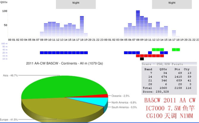 如果从正式比赛的角度来看,这次犯了不少错误,没有准备,仓促上阵,几年不参加比赛,规则都忘了,不知道AA是不分有辅助和无辅助的,整个比赛没有用cluster辅助,吃亏了。本来准备玩单波段,临时架设的天线,40m噪声大,事先没有心理准备,在条件不够的状态下玩了多波段,而且可以比赛的时间又不够充分,影响最终得分。