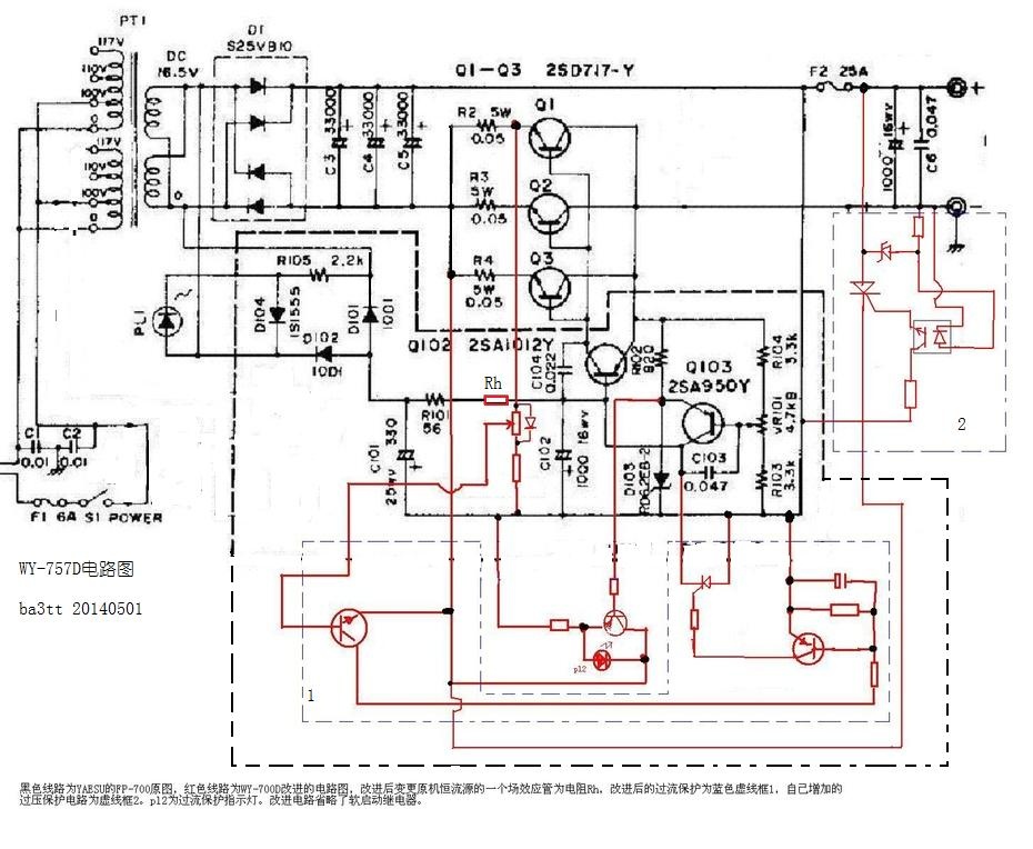 电源淘回来了,指示灯亮但没有输出,想鼓捣一下,网上竟然找不到关于WY-757D的任何资料,只好暂先画了个草图,才发现这个电源和YAESU的FP-757的电路图基本一样。莫非,这个电源就是FP-757的山寨版?