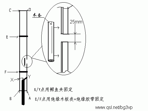 - 带鳄鱼夹的50欧线夹在图中的馈电点X/Y,把天线整体用绝缘胶带固定在一根木棒上,立在较空旷处,就可以测驻波了,调整鳄鱼夹在天线上的部位,使得驻波最小.没有驻波表的朋友,可以用接收信号的方法,接收145MHZ附近信号,看接收机的S点,直到接收的S点最多.