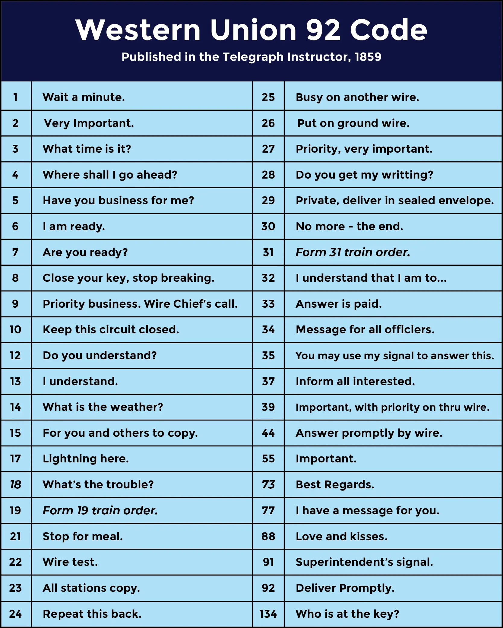 1859年,Western Union 正式推出了“92代码”,这一名称来源于最初设计的92个数字代码,每个数字对应一个常用短语或句子。 这些短语涵盖了电报通信中常见的指令、问候语、确认信息等,广泛应用于商业交易、铁路调度、新闻报道以及个人通信。 - 命名之谜