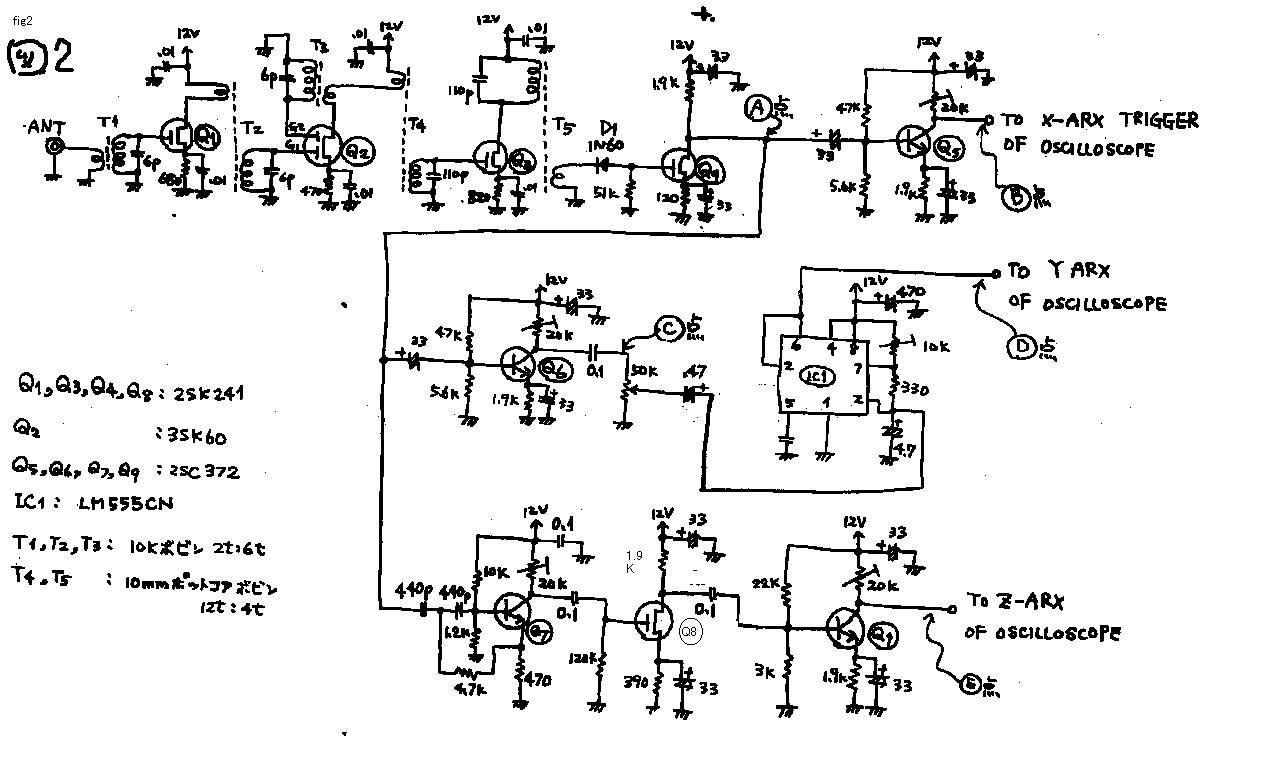 See fig 1! The signal (comming from the antenna) is amplified and detected. It has the same circuit as a FM radio. But detector of it is amplitude modulation detector. This radio do not have tune control. This machine is able to receiv only the first channel. Receiving frequency is tuned by core of T3. On the (A) point of fig2, I can watch the TV signal indicated on the textbook. See fig 3! I show you the (A) point signal. (A) point signal includes picture signal and horizontal synchronous signal and vertical synchronous signal. Each signals are separated by the signal separator. The famous oscillator IC (555) products the vertical sweep signal. And it is synchronized by the separated synchronous trigger signal. Z input of oscilloscope indicates only black or white. It can not display the gray. It is TTL level input. Therefore the picture on the oscilloscope is only yes or no. It can indicates only the outline of the picture. The Brown tube of oscilloscope is not so bright as that of sold TV set. So I must look it on the dark room.