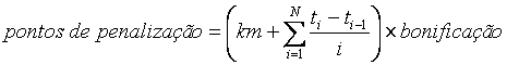 Uma prova com 3 emissores (N = 3) e uma equipa com 1 elemento (bonificação = 0.90), admite-se que desde o inicio da prova até descobrir o último emissor, percorreu 50 km, e considerando que iniciou a prova às 14h30 (inicio dos tempos às 14h30, então t0 (tempo do “cronómetro” do inicio da prova) é t0 = 0 min; descobriu o primeiro emissor às 16h30 (t1 = 2h = 120 min), o segundo emissor às 17h00 (t2 = 2h30 = 150 min) e o terceiro (último) emissor às 17h10 (t3 = 2h40 = 160 min), a sua penalização em pontos, é: