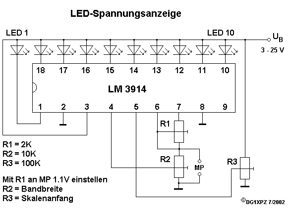 Für die Spannungsanzeige wurde aus Sparsamkeitsgründen der Dot-Mode gewählt (Pin 9 an Ub = Bargraph-Mode).