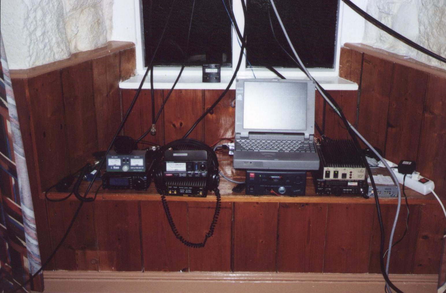 left: FT-100 with SWR-meter, beside 100W-70cm amplifier middle: 12V supply, notbook with packet software right: TR-751, 150W 2m amplifier, 1200Bit/s Baycom-modem