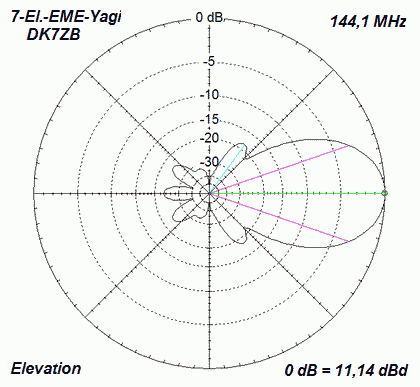 Boomlength 3,28 m Gain 11,14 dBd and F/B 23 dB at 144,1 MHz 3-dB-hor: 38,2� 3-dB-ver: 42,6� |