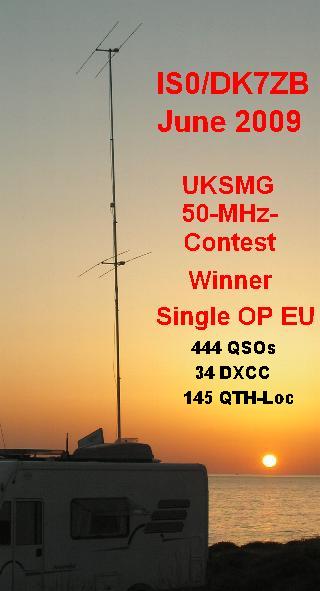 Short data: Gain 4.7 dBd, F/R >20dB Bandwidth 300 KHz (50.0-50.3 MHz) at SWR < 1.5, -3 dB hor. 66,6°, -3 dB vert. 123,4° The antenna has an unbelievable pattern, but must have a very clear surrounding! Do not use this Yagi in a "christmas-tree" of other antennas. The UKSMG-Contest 2009 was won with the stacked array 2 over 2 as you see in the picture right. Stacked Array: Gain > 8 dBd