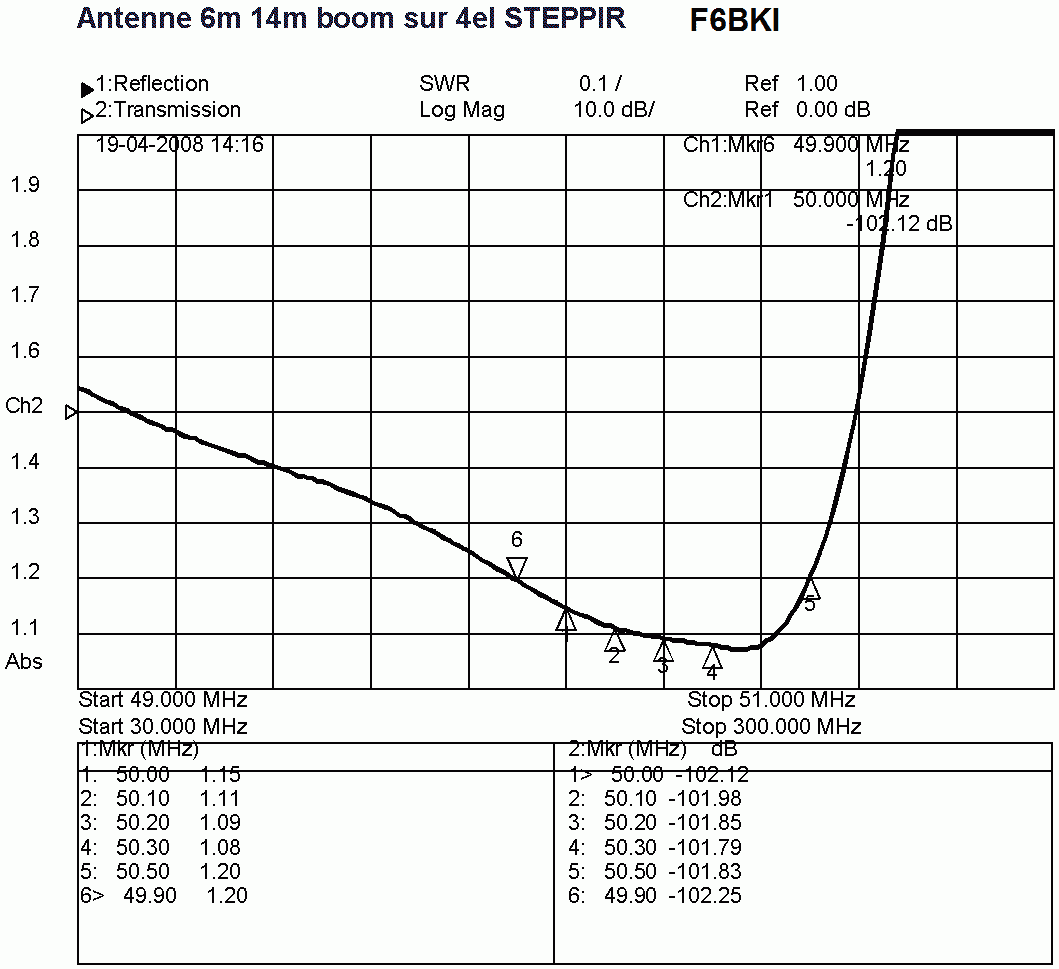 Short data: Gain 12.34 dBd (14.49dBi), F/B 34dB, bandwidth 1MHz (49.4-50.45 MHz) at SWR < 1.5 Excellent pattern, bandwidth and gain. I used this Yagi for 2 years with very good results. These data will not be reached by any comparable known Yagi, the first choice for 6m-EME and severe DX!