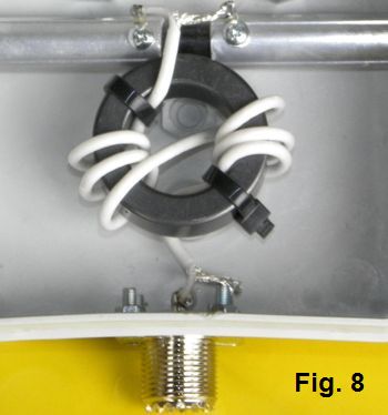 For balancing and common wave suppression a simple W1JR-balun is used [5]. The 2x 3 turns coax cable can be applied to a toroid core. High power up to 1 kW is possible with Aircell-5 and is shown in Figure 7 on an Amidon FT240-43. Up to 300 watts, you can also take the smaller and cheaper FT140-43, which is wound with Teflon coaxial cable RG188 (Fig. 8). | ![]() |