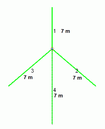 This antenna was used at the DX-peditions by CE0Y/DK7ZB and CE2/DK7ZB in October 2010 with good results. The supporting structure is a 15-m-glassfibre mast of DX-Wire. The antenna can be used on all bands from 10-40 m. You need 4x 7-m-wires.The lower guys are the 7-m-radial-wires of the Triple Leg, the upper guys are insulated ropes made of dyneema. The antenna is fed with a 400-Ohm-Wireman cable. Of cause you need an symmetrical antenna tuner for this antenna. In this case the twinlead was 12 m long. See the impedance points in the tables below. |