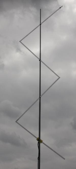 Stacking the antennas Two asymmetrical ZZ antennas can be stacked well if one feeds the upper antenna down and the lower antenna at the top. This minimizes the length of the stacking cables. The distance between the two antennas should be 1 m (lambda / 2). For example, with a 2x4 element ZZ, a respectable gain of 7.7 dBd is obtained. However, the two antennas must be fed 180 ° phase-shifted. This is achieved by connecting the coax cable inner conductor on different sides. |