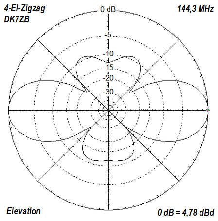 There is only one feed point with an impedance of 200 Ohm in the lowest section. This allows easy matching and balancing for a 50-Ohm-coaxcable with a half-wave phasing line is possible. The angle to the mast is 45 ° for all sections. The connection of the balun, the centerpiece of the fed and the lower portion is shown in Figure 14. The lengths refer to the center of the drill holes. The element center gets a 4 mm drill hole. This can be fastened with a cable tie to a non conductive mast. With this antenna, a gain of 4.7 dBd is obtained in two directions, the horizontal opening angle is 85°, the vertical is 37.5°. The slightly asymmetrical radiation patterns can be seen in Figures 15 and 16. Just for comparison: The well-known HB9CV-2 element directional antenna has a gain of 4.15 dBd in only one direction. |