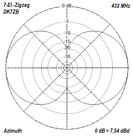 A 7-element antenna is shown in figure 19. Dimensions may be found in Table 3. The described adaptation and transformation with the quarterwave 72/50 Ohm the SWR is throughout the 70-cm band <= 1.5. |