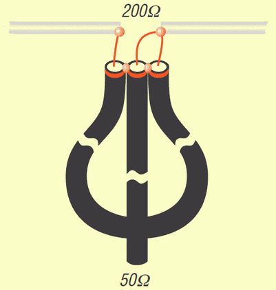 With quarter-wave coax-cables now higher impedances at 200 Ohm can be matched. 288 Ohm in that way with 72 Ohm which can be realized with two parallel 50- + 75-Ohmn-cables. In the simplest case, this is done with RG58 and RG59, better are Aircell-5 and a good CATV cable, such as RG6. This technique has been described in detail in [5]. At 450 Ohm, the 112.5 Ohm can be brought to 50 Ohm with 75-Ohm-cable. If a low additional standing wave ratio is accepted, the impedances can also deviate within certain limits. |
