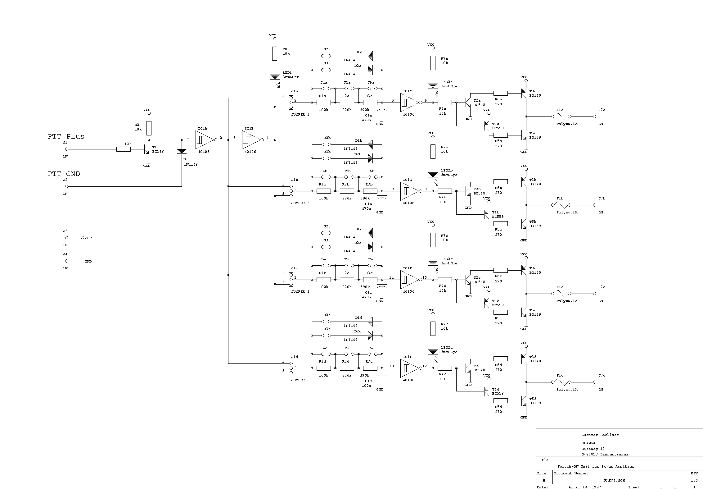 E: Since I have much experience with blowing coax relays or preamps, I constructed this circuit. It has push-pull outputs, which can drive a PTT to ground or a +12V as a direct supply for a preamp. Its delay times are configurable as well as the output polarity and the delay on TX start or RX start.