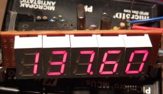The prototype (with R4..R11 = 390 Ohm) drew an average supply current of 40 mA (with 5 low-efficiency digits). With high-efficiency or low-current displays this can be significantly reduced. With 1kOhm segment resistors, the display draws a total current below 20 mA (with 5 digits "SC39-11"). The PIC itself draws about 4 mA at 20 MHz, and less than 1 mA when running at 4 MHz - so the preamp draws more current than the controller itself !