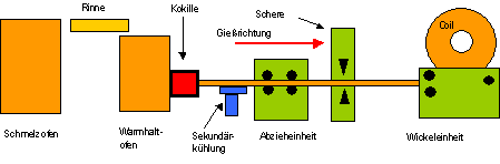 Im Schmelzofen werden Kupfer, Zinn und Phosphor, der jeweils gewählten Anforderungen entsprechend zusammengesetzt und erschmolzen, natürlich werden auch Kundenrückläufe mit verarbeitet. Die Materialien werden erhitzt bis auf ca. 1250°C. Die Leistungskapazität solcher Öfen beläuft sich auf ca. 450 bis 900 KW, je nach Größe der Anlage. Die Schmelzkapazität beläuft sich auf etwa 1 bis 2,2 t. die Stunde. Wenn die Schmelze seine Gießtemperatur erreicht hat wird sie auf ihre chemische Zusammensetzung hin analysiert, berichtigt, und dann erfolgt der Überführung, über die Rinne in den Warmhalteofen. Die Aufgabe des Warmhalteofens ist es die zu vergießende Schmelze aus Qualitätsgründen auf eine konstante Temperatur zu halten. Das flüssige Metall bekommt seine Form und Struktur in der Kokille, wo bis zu seiner Erstarrung Wärme entzogen wird.Der Strang tritt, je nach Legierung mit ca. 300 bis 600° C aus der Kokille heraus, dies ist natürlich eine gefährliche Temperatur, und muß über die Sekundärkühlung oder Sprüh-Wasser- Kühlung dann auf Raumtemperatur gebracht werden.Die Abzieheinrichtung hat die Aufgabe den Strang mit reproduzierbaren Zyklen aus der Kokille zu ziehen und durch die fliegende Schere zu drücken bis es zur Wickeleinheit gelangt und aufgerollt wird. Wenn das Coil die geforderte Länge oder Gewicht erreicht, schneidet die Schere den Strang durch und es geht wieder von vorne los.