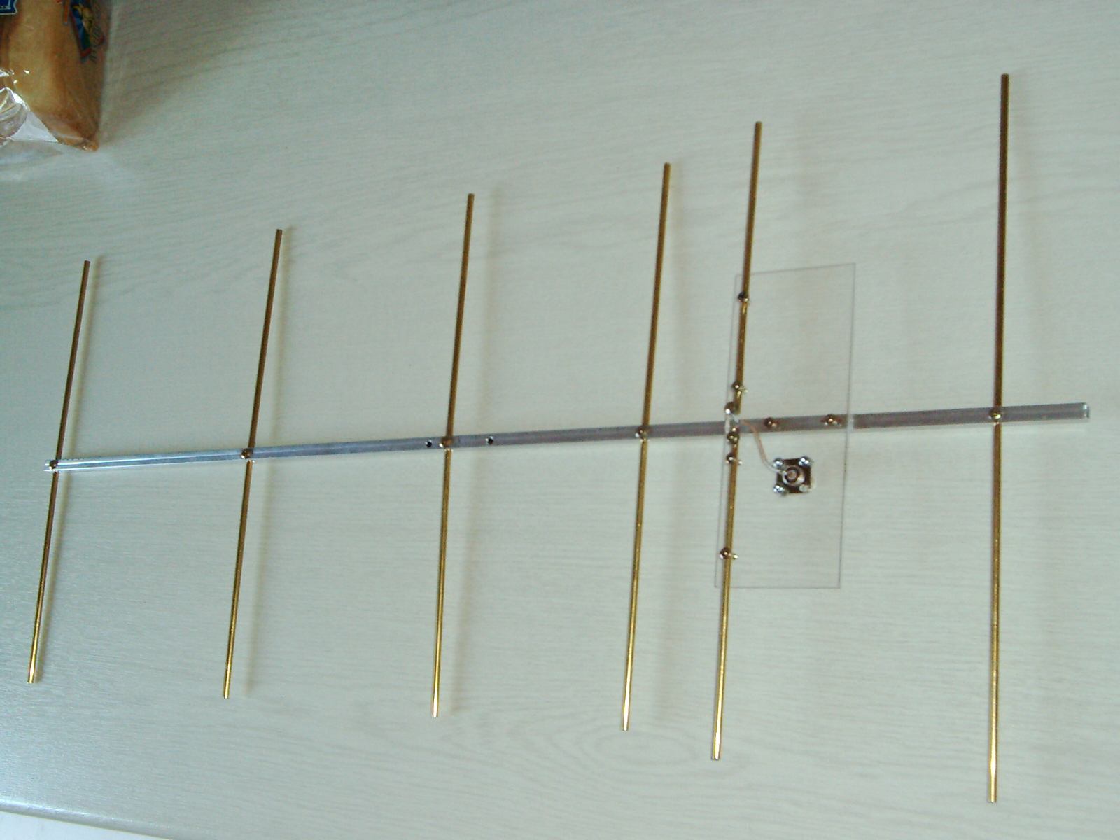 Hier sieht Ihr meine frisch gebastelte 6-Element Yagi für das 70cm Band. Die Stäbe rutschen nicht; Kabelanschluss BNC