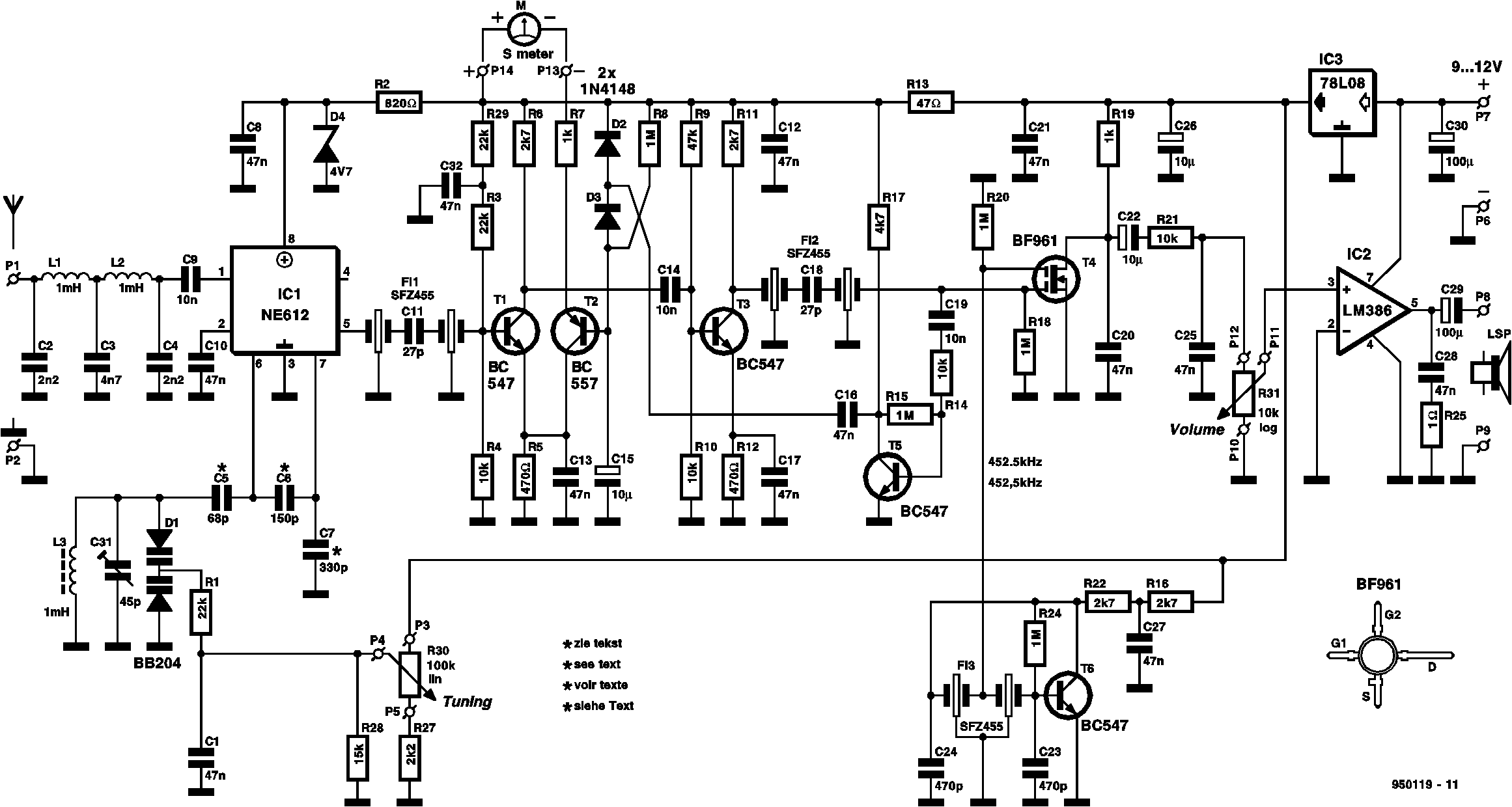 So, hier ist die Schaltung des Empfängers, da in dem Frequenzbereich wofür das Gerät konzipiert wurde keine FAXE(es handelt sich nicht um das dänische Bier!) mehr zu empfangen sind, habe ich eine Mutation für 80m vorgenommen. Holger Eckardt-DF2FQ hat die Daten für 80, 40 sowie 20m bekanntgegeben. Klickt einfach auf das Bild und und die Schaltung erscheint größer. Beim BFO habe ich eine kleine Korrektur vorgenommen, um SSB empfangen zu können. Für C24 und C23, habe ich anstatt von je 470pF, je 1,6nF Styroflex eingesetzt. Die Bauteileliste und anderen Angaben kommen später. Ihr könnt natürlich eine Platine ätzen, sie hat aber einen kleinen Fehler im Audio-Bereich (Pin 2 und 3-LM386), in Verbindung mit dem LM386. Wenn Ihr auf dem Bild draufklickt, erscheint das bereits korrigierte Bild, also die richtige Platine. Die Platine wird dann folgender Massen bestückt: Für den Fax-Empfange braucht Ihr eine Interface, die Eure Schaltung mit dem Rechner verbindet. So könnte sie eventuell aussehen: Ich verspräche Euch, ich kümmere mich darum und suche die Bauteile-Liste, für ungeduldige, die mit dem Bau nicht mehr warten können, einfach eine E-Mail schicken und ich gebe Euch die Daten der Spulen für das jeweilige Band und so...