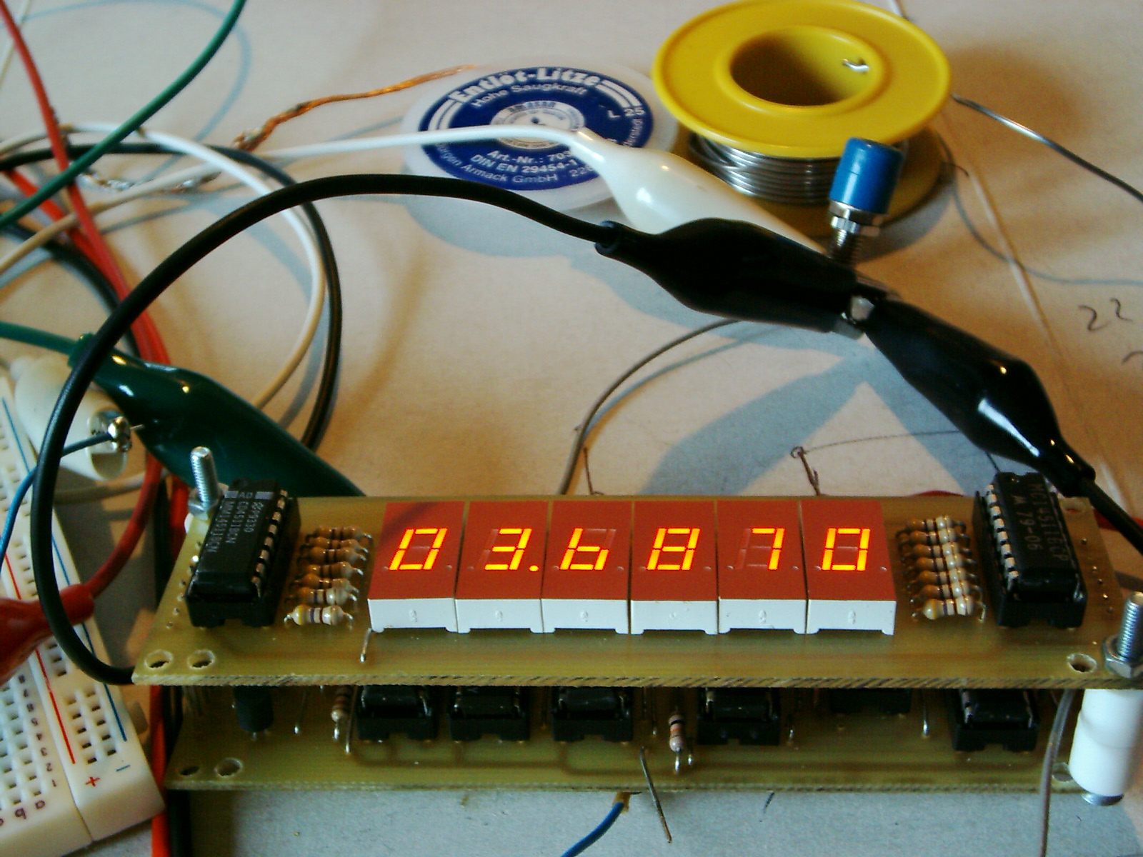 Ich habe gerade angefangen einen Frequenzzähler zu bauen. Dabei wollte ich vermeiden, dass der Counter mit PIC (und Software...) arbeitet. Ich werde aber demnächst meine Angst besiegen und auch Basteleien mit PICs wagen. Nun, zum Zähler: eine 6-stellige Anzeige und eine Auflösung von 1 Hz, bis 1 MHz und 1 kHz bis 40 MHz lässt uns hoffen, dass der Counter auch in AFU-radios einsetzbar wird. Später werde ich einen neuen 1:1000 Vorteiler bauen, damit der Zähler bis zu über 1 GHz Verwendung findet.