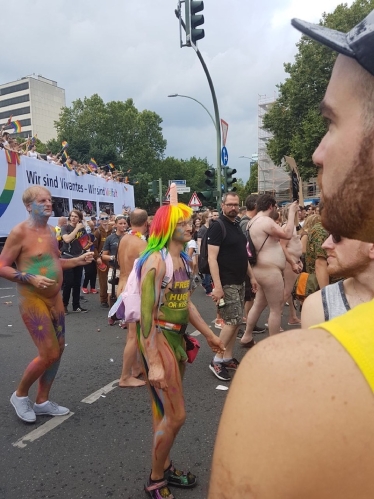 Es ist also ganz offensichtlich auch vom Gesetzgeber her, völlig in Ordnung wenn ein Mädchen im noch schulpflichtigen Alter, auf offener Straße, im Berliner Stadtzentrum, die Möglichkeit geboten bekommt, einem Man mit vollkommen entblößten Geschlechts-organen zu begegnen (und nicht nur einem Einzelnen, wie die Fotos auf dieser Seite zeigen). Man sollte eine Teilnahme von Kindern am "CSD" strickt verbieten (wozu gibt es sonst das Jugendschutzgesetz) .