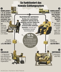Das Hawala-System ist mehr als nur umstritten: Bei dem weltweit agierenden Netzwerk ist keine Bank involviert, Geldbeträge werden stattdessen formlos über Geschäftsleute oder Kleinunternehmen aus dem Ausland in Krisenländer wie Afghanistan oder Somalia transferiert. Laut dem Bundesamt für Verfassungsschutz spielt das System »eine erhebliche Rolle« bei der Finanzierung von dschihadistischen und terroristischen Aktivitäten weltweit.