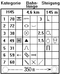 auf der ganzen Welt verstanden zu werden. Das Beispiel rechts zeigt in der obersten Zeile die Altersklasse (Kategorie), die Bahnlänge (in Kilometern oder Metern), die als Luftlinien-Entfernung die theoretisch kürzeste Ver- bindung zwischen Start, allen Posten in der vorgegebenen Reihenfolge und Ziel angibt und die Steigung. Letztere ist in Metern angegeben und gibt die zusammenaddierten Anstiegs- höhenmeter auf einer vom Bahnleger definierten Idealroute an. Die folgenden Zeilen be- schreiben jeweils den Standort eines Postens, und am Ende folgt die Wegbeschreibung vom letzten Posten zum Ziel. |