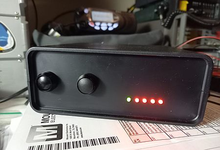 Die Beinchen der 4 roten Antennenstrom-Kontroll-LEDs (LED1 bis LED4) kann man lang genug lassen, um sie im 90°-Winkel abzuknicken und in der vorderen Gehäusewandung durchzustecken (siehe Bilder). Gleiches gilt für die grüne 5-V-Kontroll-LED.