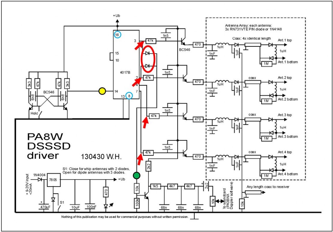 Gelbe und grüne Punkte sowie blaue Kreise bzw. rote Pfeile und roter Kringel siehe Hinweise zum Aufbau eines SSSD mit mehr als 4 Antennen.
