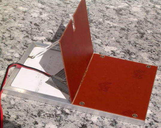 Beide Hälften sind mit einem Scharnier auf der Innenseite zusammengelötet. Das Band bewirkt, das das Modul beim Aufstellen einen Winkel von 45