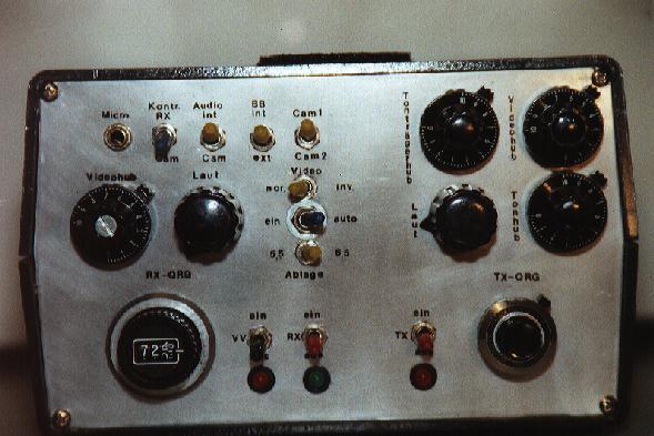 Rechts ist der Sendeteil mit Sendeschalter, Video-, Ton-, Lautstärke und