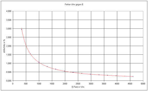 Bei der derzeitigen Beschaltung ergab sich, dass eine Spannungsänderung der FM-Ausgangsspannung von 1mV eine E-Feld-Änderung von 22,5 V/m entspricht. Durch die Offsetschwankung der Elektronik von 0,5-1mV ergibt sich damit ein absoluter Fehler von +- 22 V/m. Die Linearität der Messung ist auch bei höheren Feldstärken sehr konstant.