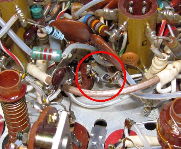 Now the KWM-2A had to come out of the box. Tracing the signal with an oscilloscope in TUNE mode showed full signal out of V6 and nearly no signal at the grid of V7. Close visual inspection was not easy in this crowded space, but it became clear that resistor R9 (56 Ohm) at the control grid of V7 was broken, literally exploded. Clearly, this explained the lack of TX drive and RX calibrator signal strength. Temporarily joining the ends with two clips seemed to restore correct operation.
