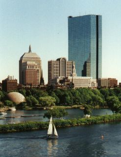 Nochmals der Blick von Cambridge aus. In der rechten Bildhälfte sieht man die Back Bay mit ihren alten Ziegelbauten mit vielen kleinen Läden, dahinter den Prudential Tower. |