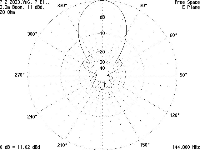 Boomlength 3,28 m Gain 11,14 dBd and F/B 23 dB at 144,1 MHz 3-dB-hor: 38,2� 3-dB-ver: 42,6� |