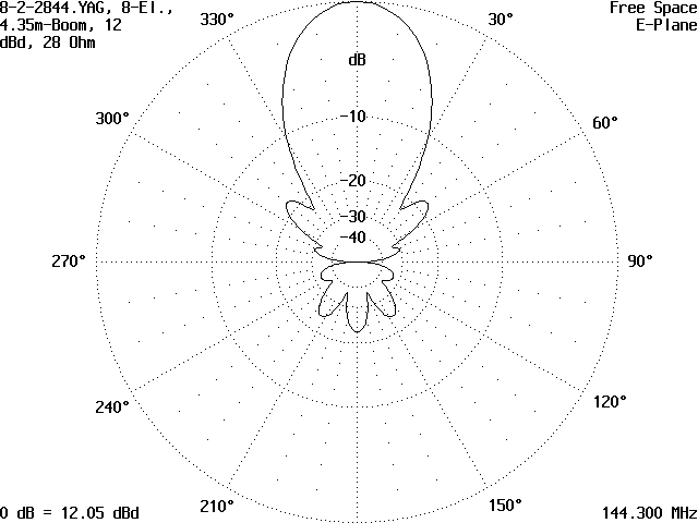 Direktorabstände [3]. Da die Antenne nur für SSB und CW eingesetzt wird, sind die Daten für die untere Bandhälfte optimiert. Zwischen 144 und 145MHz liegt das SWR unter 1,2, darüber steigt es bis auf 1,8 am oberen Bandende an. Die Rückdämpfung ist mit 22dB recht ordentlich, ein noch besseres Richtdiagramm hätte eine Gewinnminderung oder schlechteren Anpassungsverlauf zur Folge gehabt. Die von "YO" [2] geplotteten Daten wurden meßtechnisch überprüft, soweit es mit Amateurmitteln möglich ist. Dazu wurde das Richtdiagramm mit dem in [3] beschriebenen Verfahren aufgenommen. Eine weitere Analyse mit "EZNEC" [4] bestätigt die Werte recht genau. Alle
