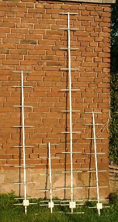 All Yagis in 28-Ohm-Technology, elements mounted with polyamid-clamps (Konni).Stacking of the Yagis will give excellent contest-groups. Picture right: 8x7-El.- built by Dirk, ON5GS Electrical details on the pages you see above, construction with "YO 7" by K6STI and "EZNEC+5.0" by W7EL 430-440MHz at SWR <1,8 (10 El. 430-438) , Boom 15x15mm or 20x20mm, Radiator 10mm, Elements 8mm or 6mm Left: Collection of 70cm-28-Ohm-Yagis built by DJ8QV |
