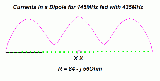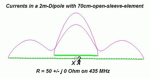 Now we add the 70-cm-open-sleeve-element to the 2-m-dipole. The currents change and we have the highest current in the parasitic fed open-sleeve element. With the correct distance we get one feedpoint for two bands, on 70 cm with 50 +/- j 0 Ohm. |