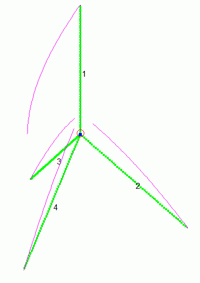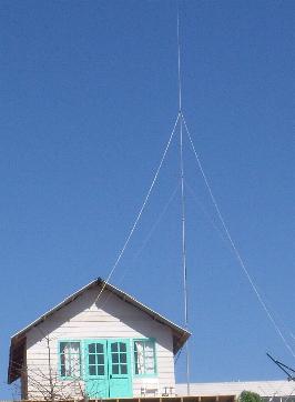 This antenna was used at the DX-peditions by CE0Y/DK7ZB and CE2/DK7ZB in October 2010 with good results. The supporting structure is a 15-m-glassfibre mast of DX-Wire. The antenna can be used on all bands from 10-40 m. You need 4x 7-m-wires.The lower guys are the 7-m-radial-wires of the Triple Leg, the upper guys are insulated ropes made of dyneema. The antenna is fed with a 400-Ohm-Wireman cable. Of cause you need an symmetrical antenna tuner for this antenna. In this case the twinlead was 12 m long. See the impedance points in the tables below. |