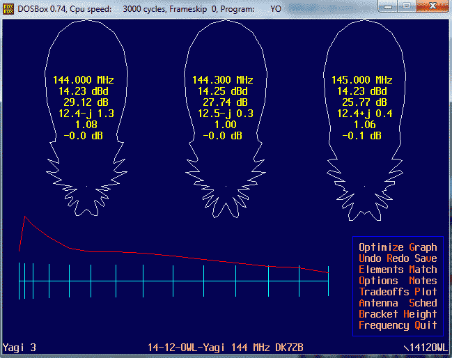 The YO-data were proved and corrected a little bit with EZNEC+5. The experience with hundreds of built Yagis with the original predictions of EZNEC show the high accuracy of the NEC-ll models in theory and practice. If you do not use bent wires or tapered elements on VHF you get really perfect results in designing Yagis. |
