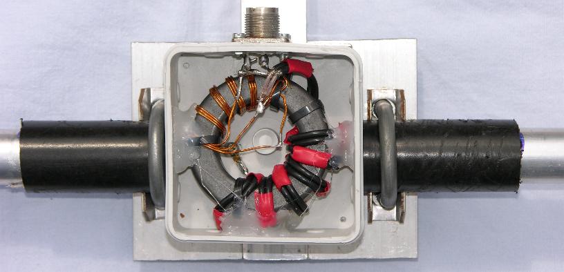 The Balun The impedance for all bands is 25Ohm, so we use a homemade balun 1:2 for the matching 25Ohm balanced to 50Ohm unbalanced. The balun has two sections on the same core and the principle is shown in the picture right. |