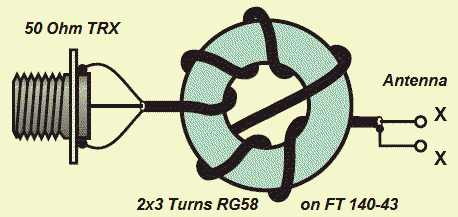 I have used PTFE-coax, but RG58 is possible, too. 2x3 turns on an Amidon FT140-66 core.