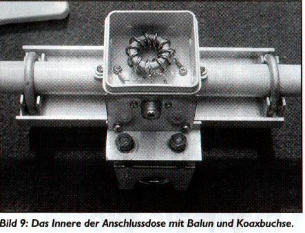 A small box with a SO-239 coax-socket contains the toroid balun 1:1 with a trifilar wounding. Up to 300 watts use an Amidon T130-6, at higher power up to 1KW an Amidon T200-6. It is possible to "stack" two cheap toroids for 500 watts with tape. The schematic of the balun is shown in picture 8. 3x10 wounds of 1,2mm-enamelled copperwire.The three wires must be drilled and wired as shown in picture 9.